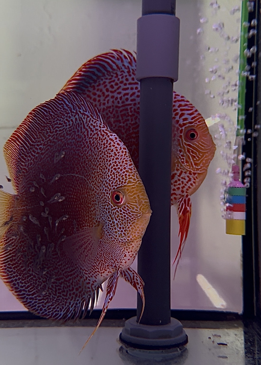 Il est préférable et fortement conseillé d’acclimater les nouveaux arrivants dans nouvel aquarium (sans autre poissons) prévu à cet effet. Il est fortement déconseillé que les nouveaux arrivants s’acclimatent directement dans votre aquarium communautaire surtout si vous ne connaissez pas la provenance de vos Discus : cela peuvent entraîner une contamination de maladies bactériennes.