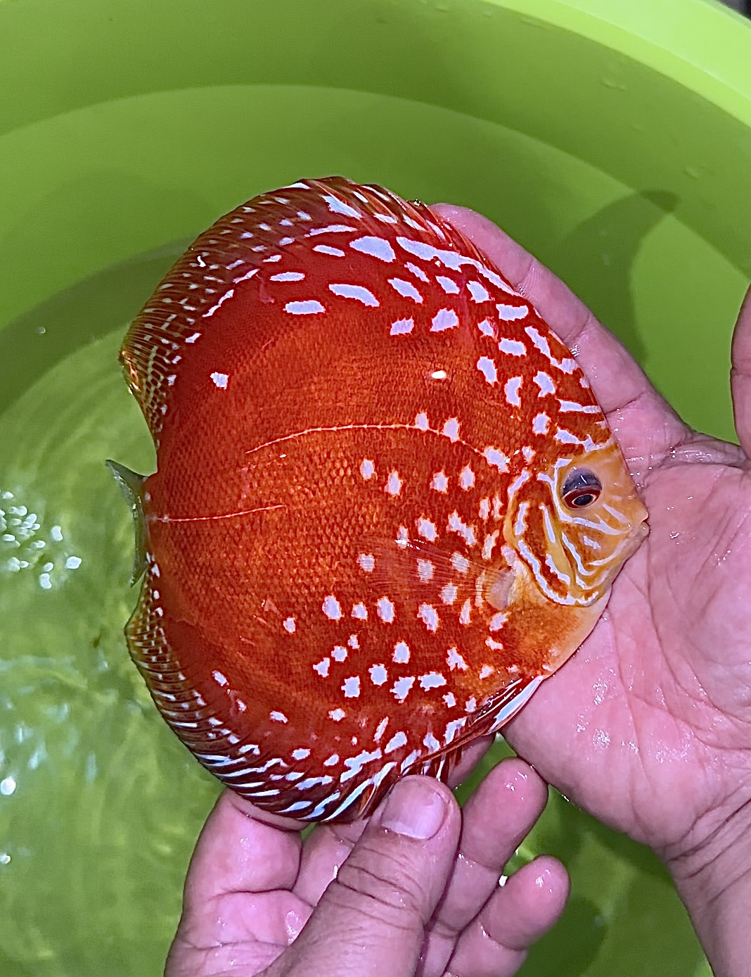 Le Discus « Météore Pigeon» est une variété issue de la lignée « Sang de Pigeon », sélectionnée pour ses motifs rouge-orangé uniques, parsemés de taches ou de stries évoquant des éclaboussures de météorite. Il ne s’agit pas d’une espèce distincte, mais d’une mutation de couleur obtenue par sélection.