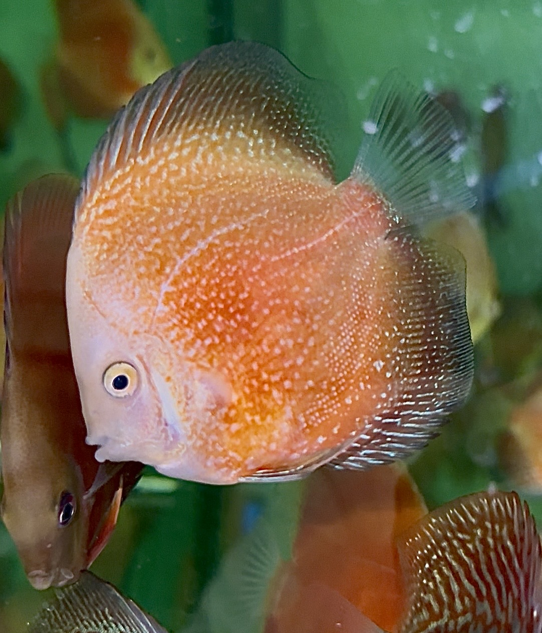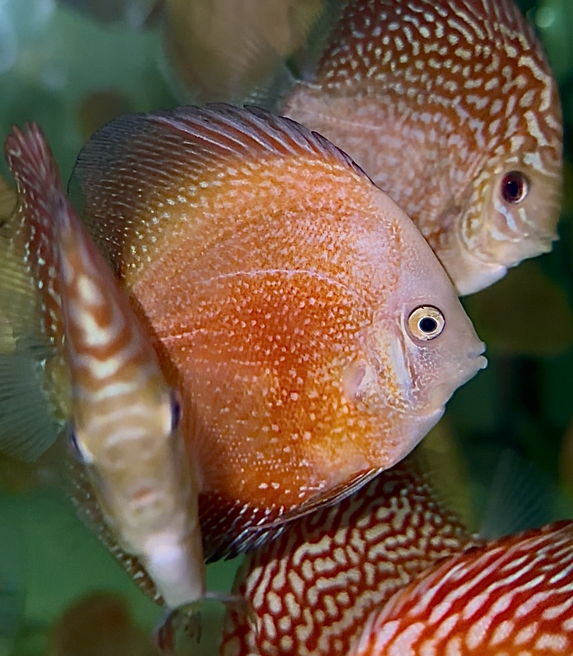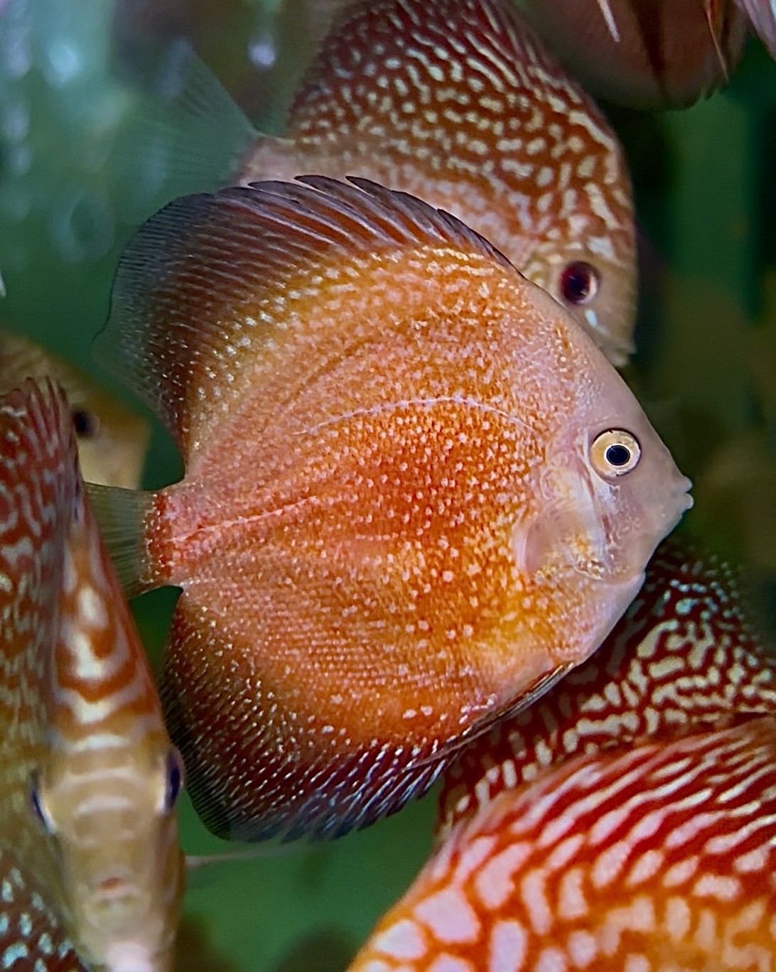 Le Discus « Pigeon Météore » est une variété issue de la lignée « Sang de Pigeon », sélectionnée pour ses motifs rouge-orangé uniques, parsemés de taches ou de stries évoquant des éclaboussures de météorite. Il ne s’agit pas d’une espèce distincte, mais d’une mutation de couleur obtenue par sélection.